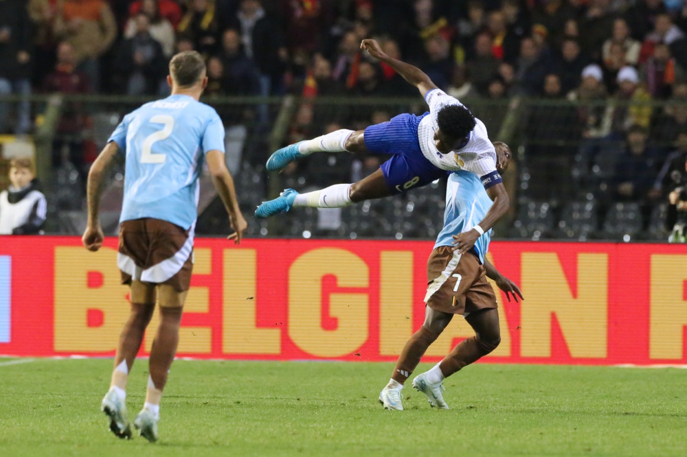 10月14日,法国队球员楚阿梅尼(上)与比利时队球员多库拼抢。新华社记者 赵丁喆 摄