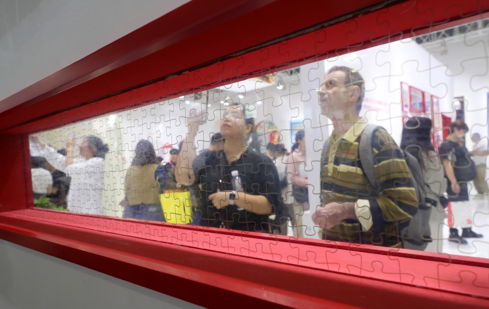10月16日,参观者在一家拼图品牌企业展台上驻足观看。当日,CTE中国玩具展&潮玩展在上海新国际博览中心开幕,超过2500家国内外玩具厂商将展出包括潮流及收藏玩具、益智玩具、木/竹玩具和户外运动用品等十七大类玩具产品。