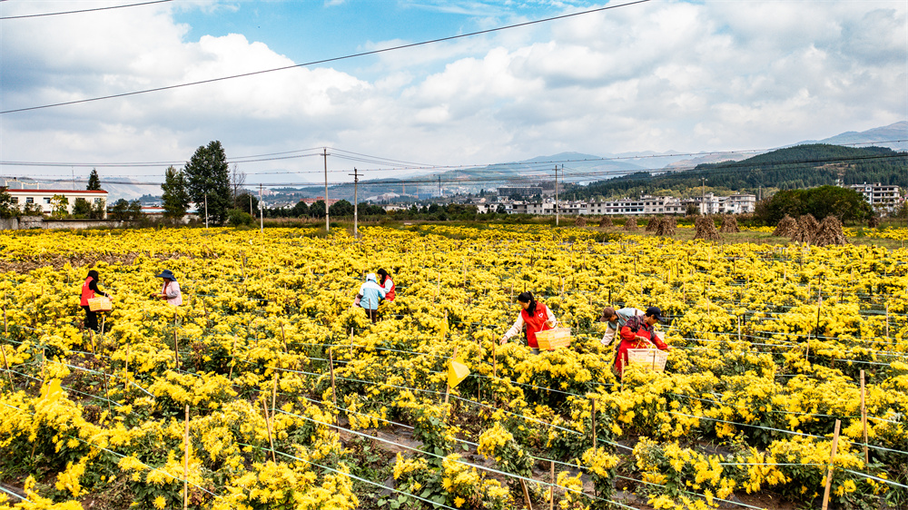 金秋时节,贵州省六盘水市钟山区大湾镇种植的300余亩金凤菊喜获丰收,田间地头一派繁忙景象。近年来,当地采取“公司+基地+农户”的形式发展菊花种植加工产业,以土地流转、用工等形式带动周边群众就业增收。