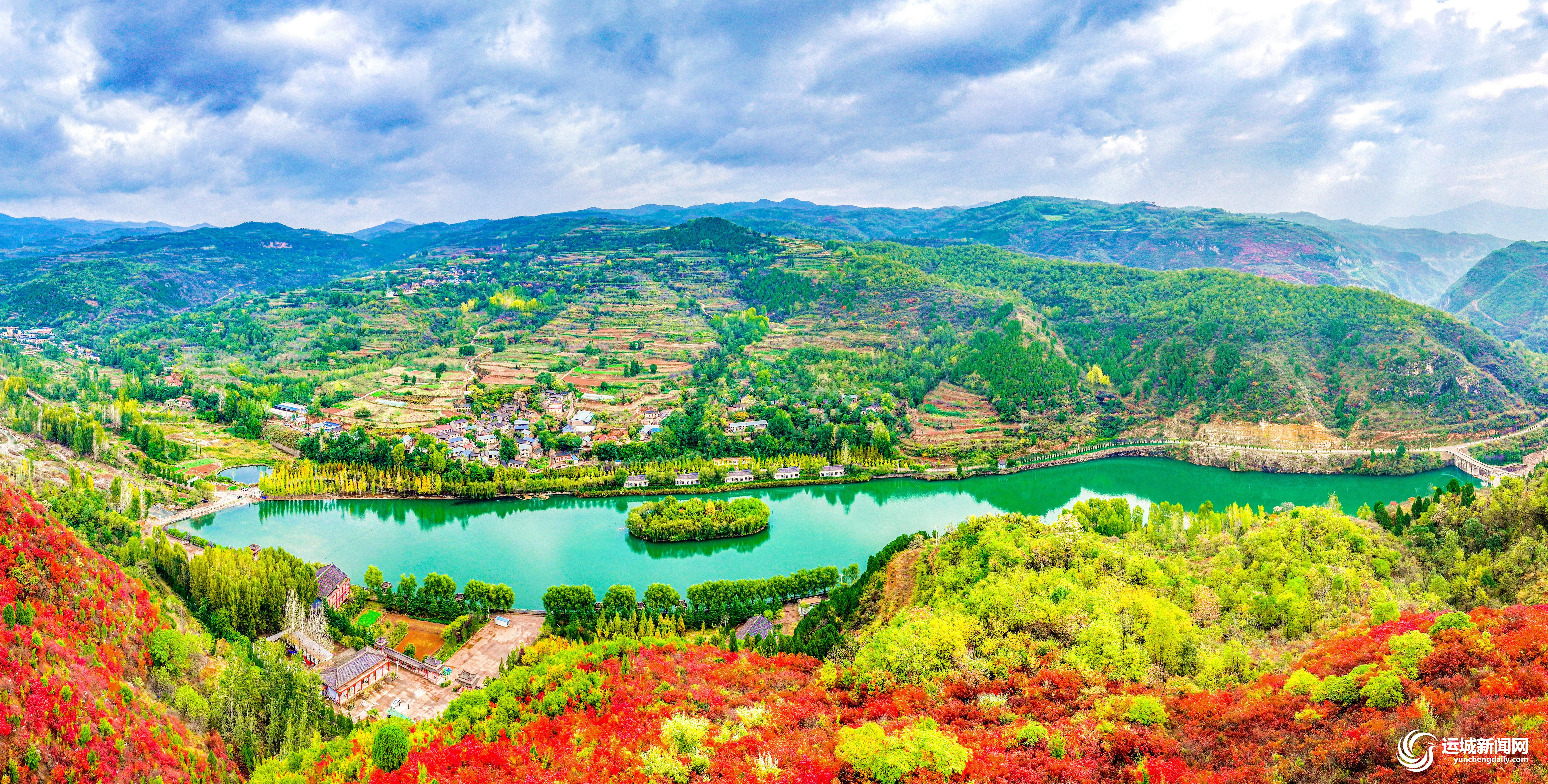10月18日,位于夏县祁家河乡的月亮湖公园,一侧满山红叶,一侧村庄梯田,与月亮湖交相辉映,构成一幅绝美的生态图景。