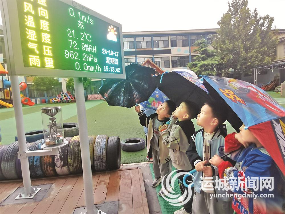 “这是量雨器,下雨时,它可以收集雨水然后计算降雨量,我们能在电子屏幕上看到雨量,就是它的功劳。”园长马建华解释说,“这是我们为开展气象课程配备的一套专门设备,包括量雨器、风速变速器、风向变送器等,希望以最直观的形式,让孩子们了解气象预报的原理,从小在孩子们的心里种下一颗科学的种子。”
