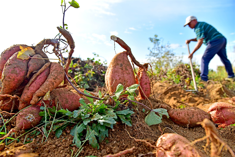 10月20日,山东省枣庄市山亭区店子镇柳泉村农民在田间收获地瓜。