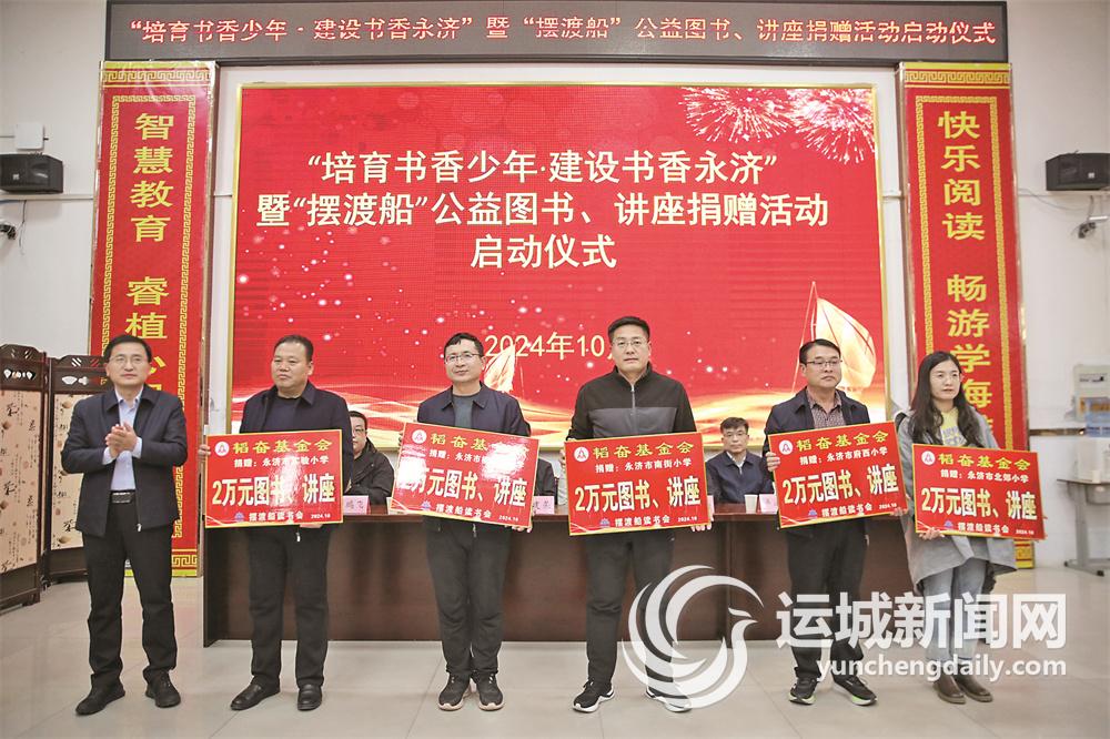 “摆渡船”阅读项目由中国韬奋基金会与“摆渡船”读书会联合共建。中国韬奋基金会是由我国新闻出版界、文化教育界的老前辈胡愈之等人于1987年6月倡议成立的非公募基金会。“摆渡船”读书会,是由中国著名儿童文学家、儿童文学阅读“点灯人”梅子涵教授倡导并发起的,是以倡导和助力儿童阅读为核心任务的文化公益组织。启动仪式上,该项目为永济捐赠了25万元的图书及讲座费用,助力点亮阅读之灯、培育书香少年。