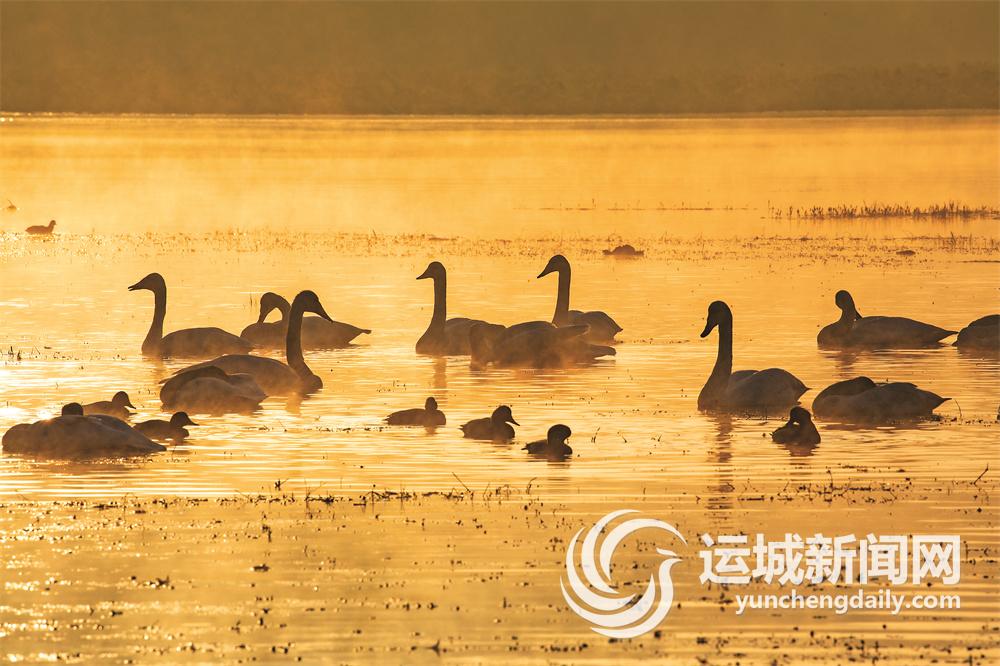 近日,平陆县三湾大天鹅生态湿地公园迎来首批栖息越冬的大天鹅。秋日的朝阳映照在斑斓的水面上,晨光和天鹅相互映衬,构成一幅迷人画卷。记者 李盛世 摄