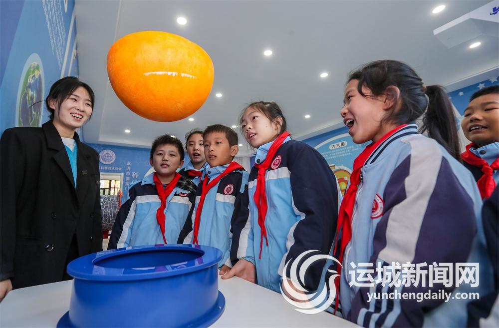 10月22日,在永济市御苑社区科普体验馆内,讲解员为柳宗元小学的学生作科普演示。