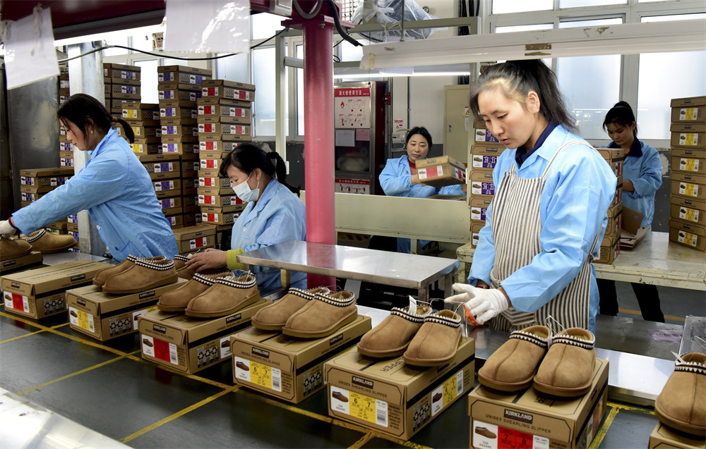 10月23日,工人在河南省上蔡县一家制鞋企业生产线工作。