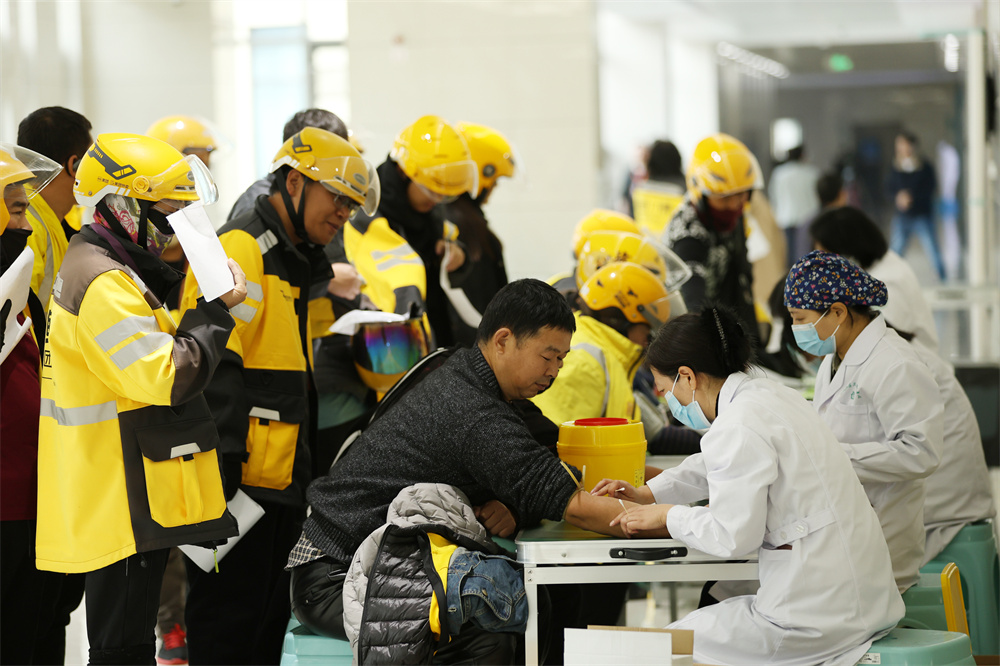 10月22日,在山东省临沂市郯城县郯城街道卫生院,外卖骑手进行健康体检。
