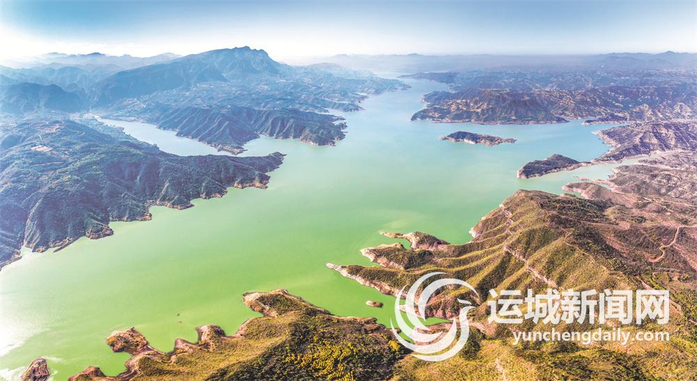 10月24日,在垣曲县蒲掌乡马蹄窝渡口拍摄的黄河美景。深秋时节,清澈的黄河水、多彩的岸畔与蓝天交相辉映,从空中俯瞰,美不胜收。记者 薛俊 摄