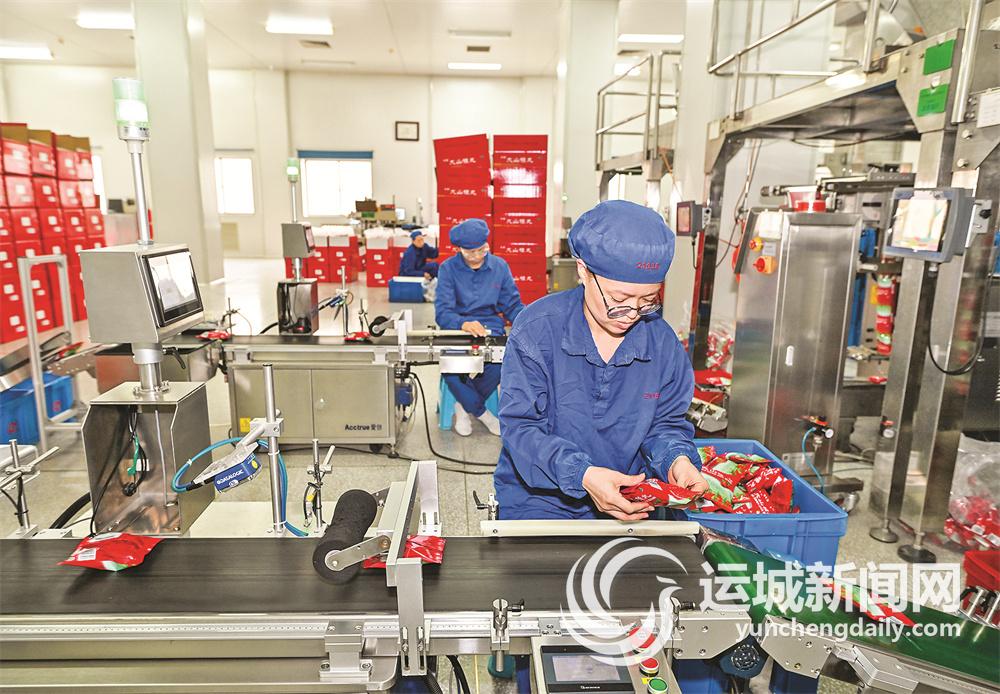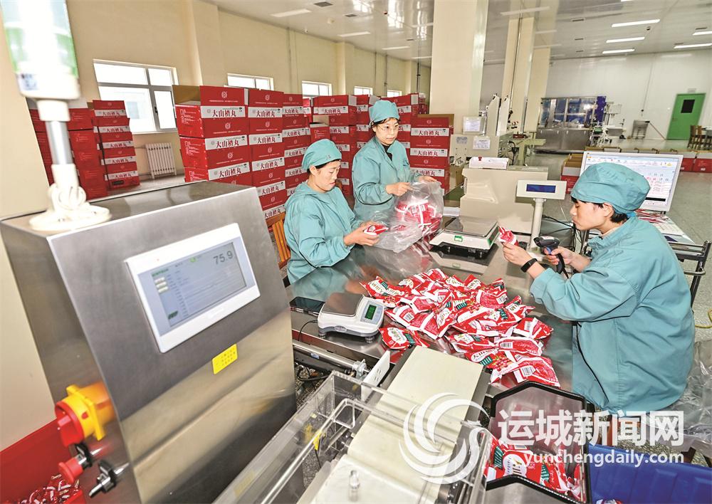 整洁明亮的生产车间内,机器的轰鸣声不绝于耳,一颗颗浅咖色、重约9克的大山楂丸先被红绿相间的塑料纸包装成小袋,再顺着传送带由自动包装机将每40颗包装成一大袋,紧接着封口、喷码、装箱,被发往全国各地。