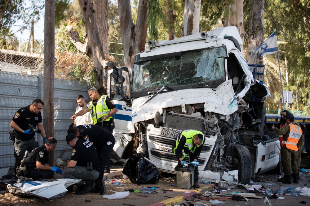 10月27日,应急人员在以色列特拉维夫事发现场工作。以色列救援机构27日说,一辆卡车在特拉维夫北部冲入公交车站,导致数十人受伤。新华社记者 陈君清 摄