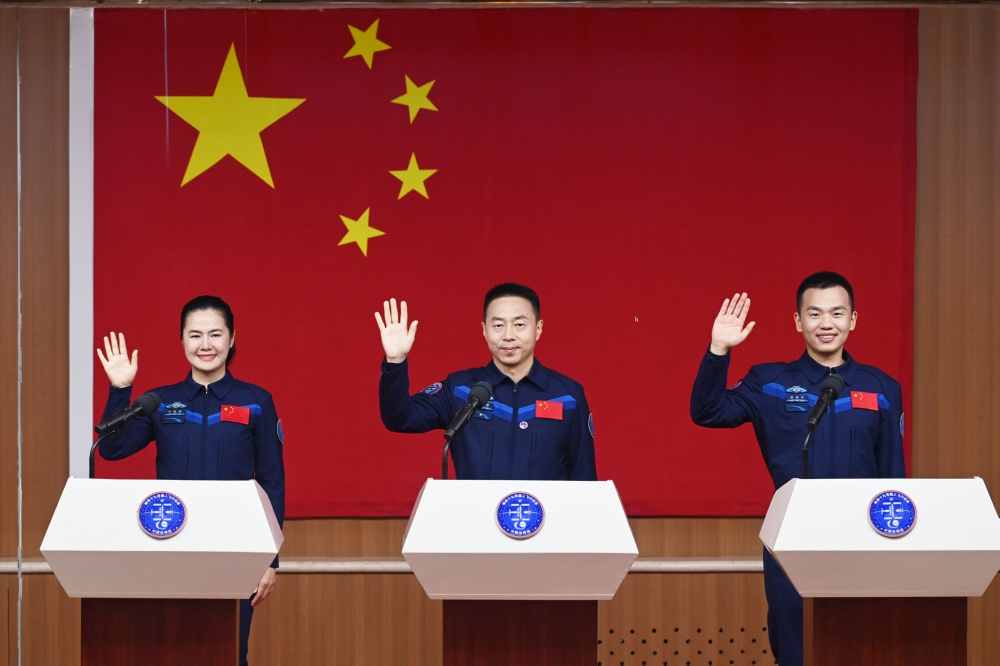 10月29日,神舟十九号载人飞行任务航天员蔡旭哲(中)、宋令东(右)、王浩泽在酒泉卫星发射中心问天阁与媒体记者集体见面。