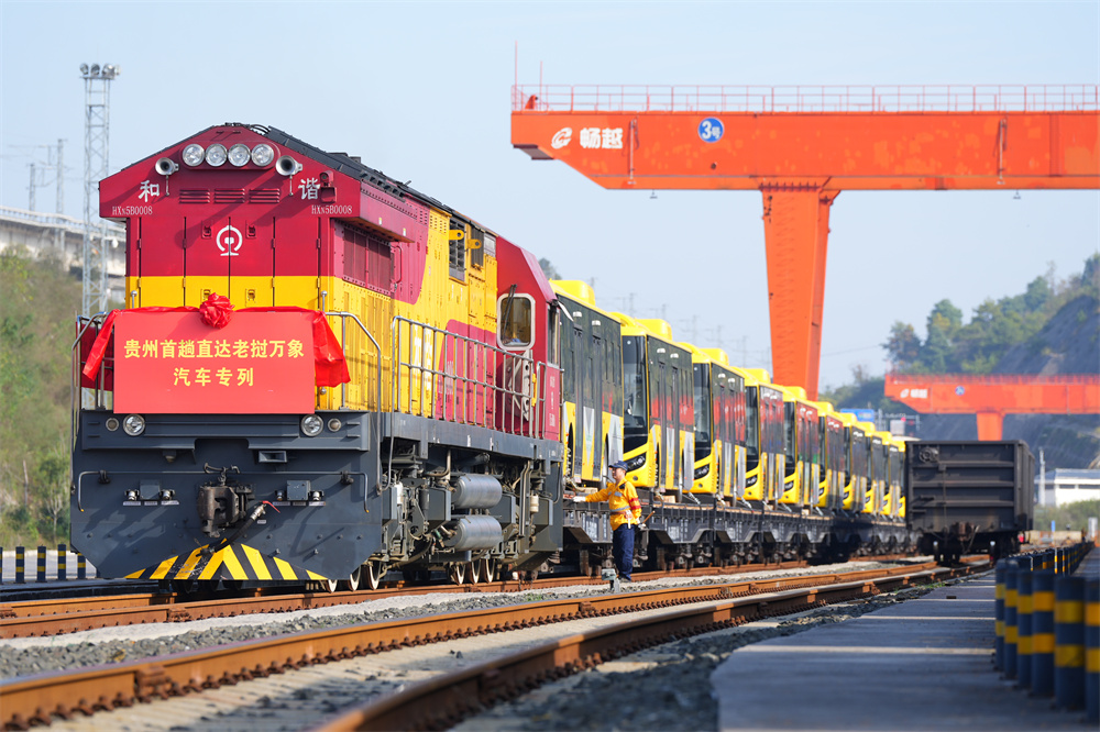 当日,一列装载28辆“贵州造”新能源客车的出口专列,从贵阳国际陆港都拉营站开出,将经由云南磨憨口岸出境前往老挝万象。这是中老铁路开通以来,贵州首次开行到老挝的汽车出口运输专列。