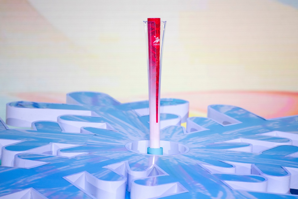 10月30日,活动现场大屏幕显示亚冬会火炬。本届亚冬会火炬主题为“澎湃”,寓意着本届亚冬会将充满活力与激情。