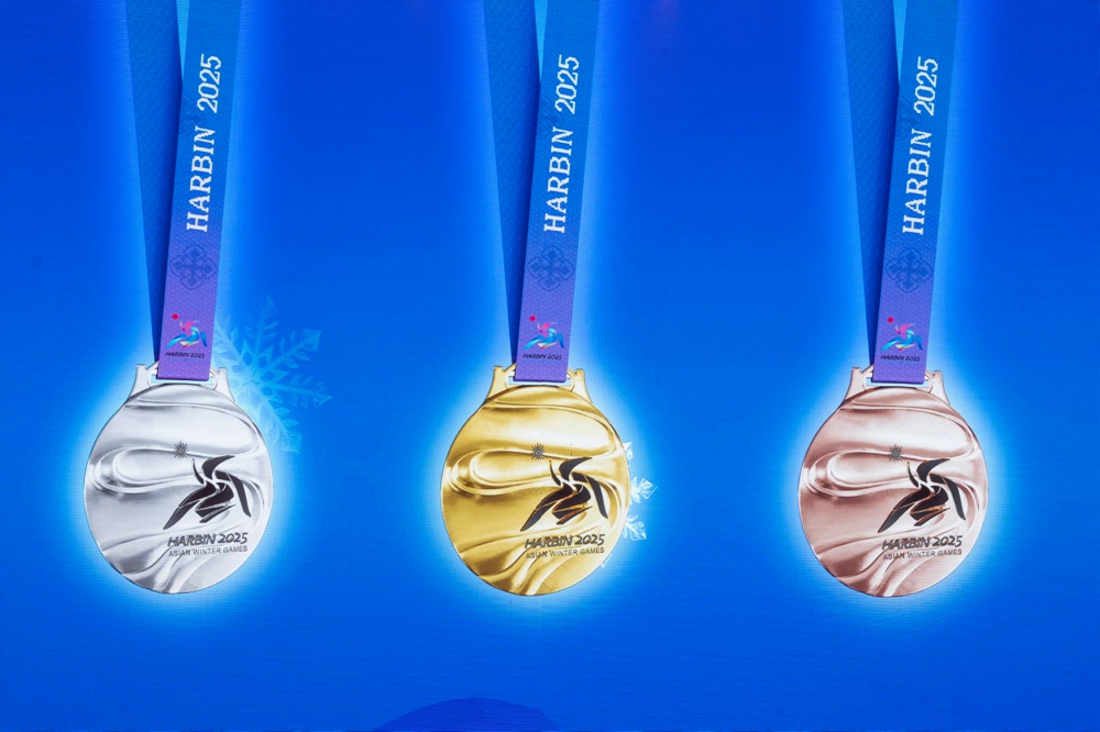 10月30日,活动现场大屏幕显示亚冬会奖牌“竞速精神”的正面。
