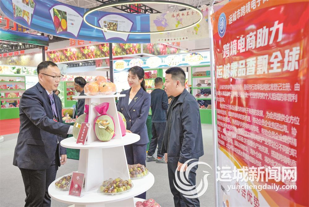 嘉宾在跨境电商展区了解水果销售市场情况。 本报记者 闫 鑫 摄