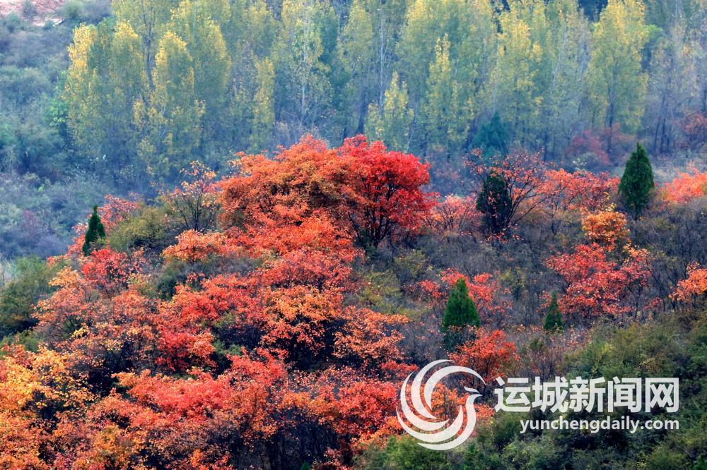 火红、橙红、明黄、浅绿……枝叶层叠,一丛丛曾经鲜绿的叶子已经悄然变脸,在阳光下呈现迷人的色彩,装饰着整个山谷,在蓝天白云映衬下,更是美不胜收,惹人心醉。
