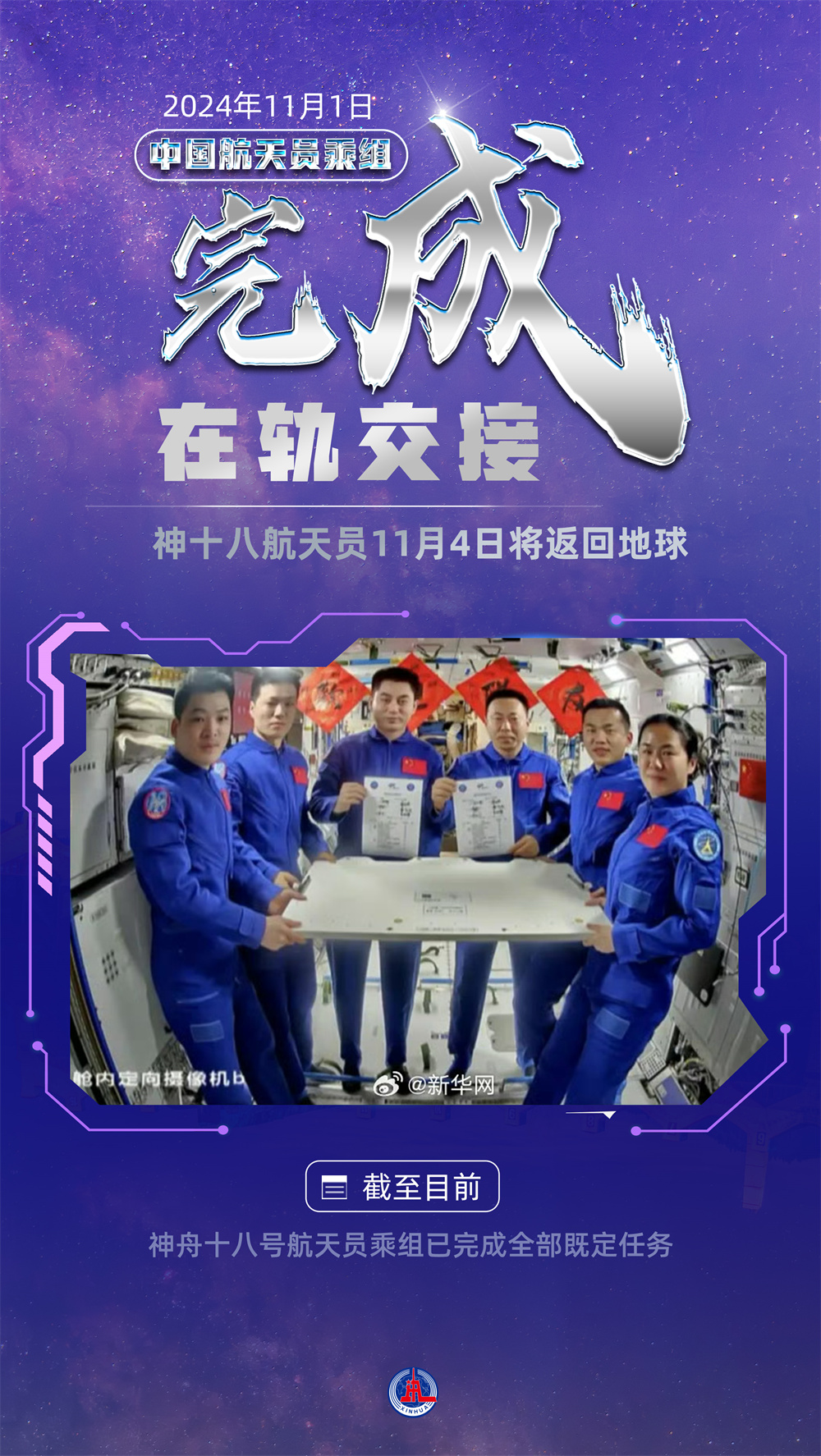 记者11月1日从中国载人航天工程办公室了解到,11月1日,神舟十八号、神舟十九号航天员乘组进行交接仪式,两个乘组移交了中国空间站的钥匙。