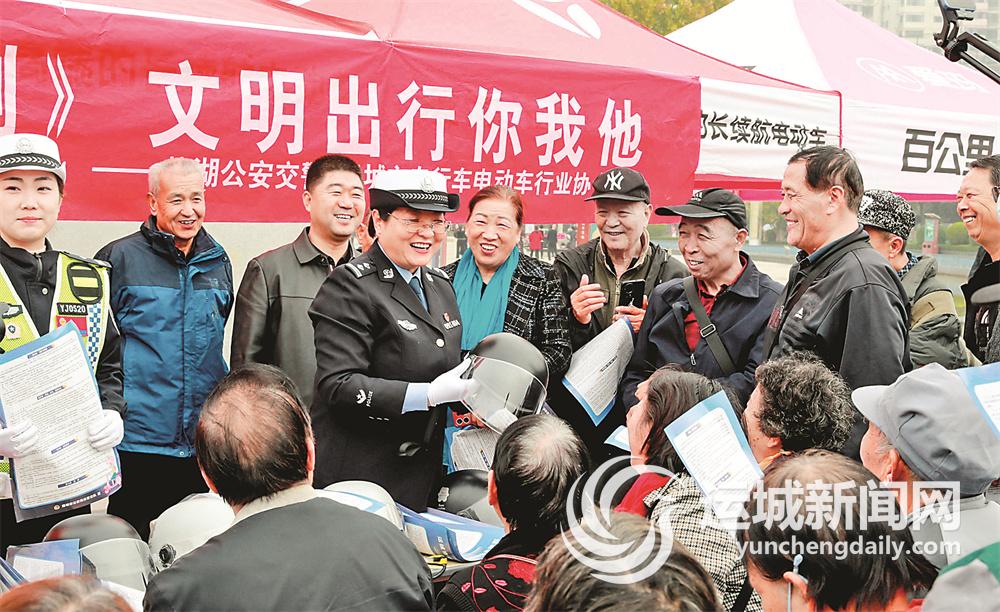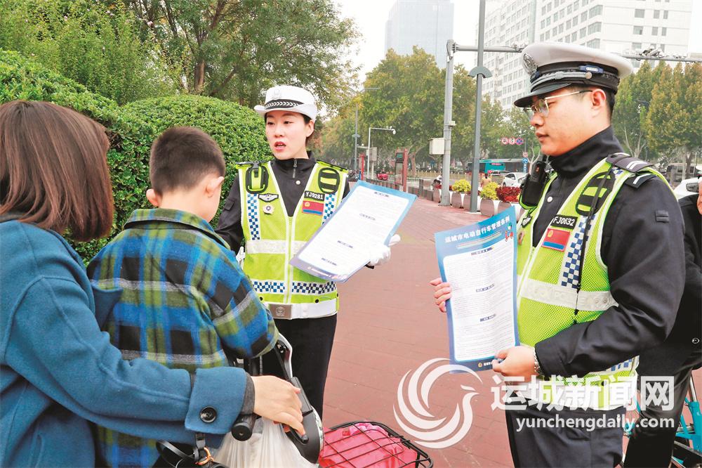 11月1日,盐湖公安分局交警大队联合运城市自行车电动车行业协会,在市区南风广场开展电动自行车新规普法宣传活动。葛崇收 谭建春 摄影报道