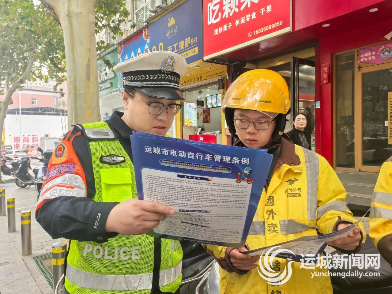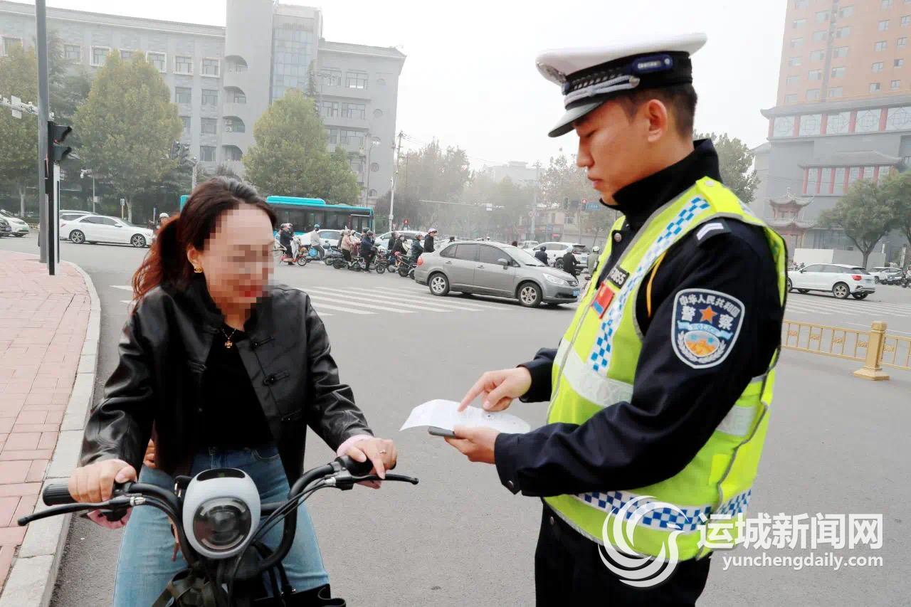 为贯彻落实好《条例》相关规定,运城各级交管部门在保障道路交通秩序的同时,继续严查严处电动自行车“闯红灯”“逆向行驶”等易致祸违法行为,同时,对于违反《条例》新增规定的,民警现场坚持教育与处罚相结合的原则,加大宣传劝导,进行普法教育。