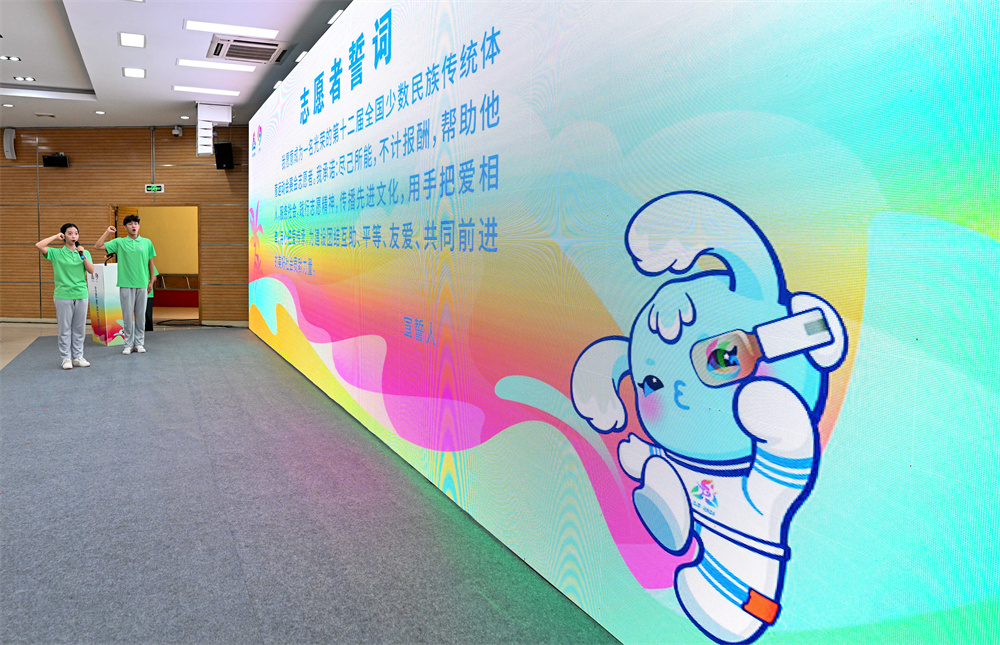 11月4日,与会志愿者在第十二届全国少数民族传统体育运动会志愿者出征仪式上进行宣誓。