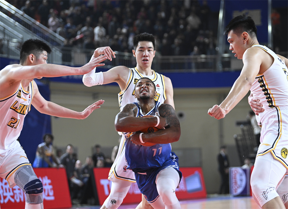 11月3日,新疆伊力特队球员皮特森(前中)在比赛中突破上篮。