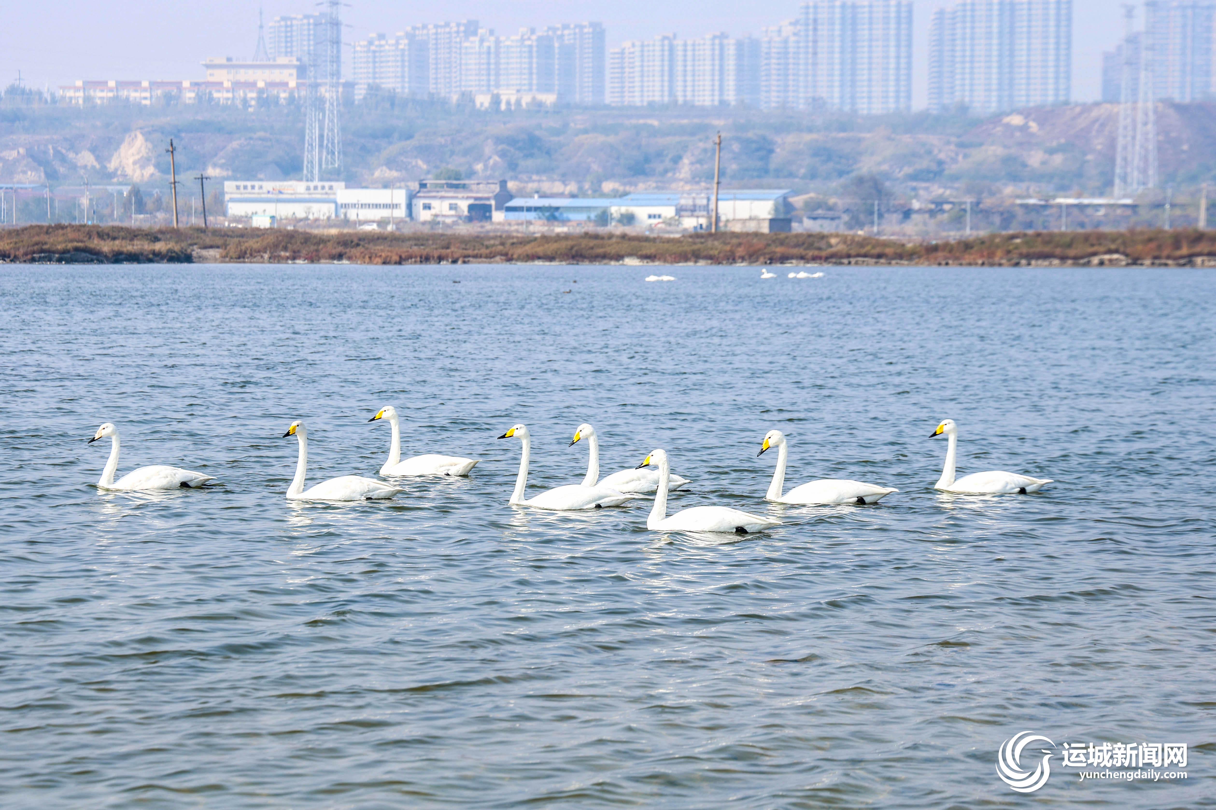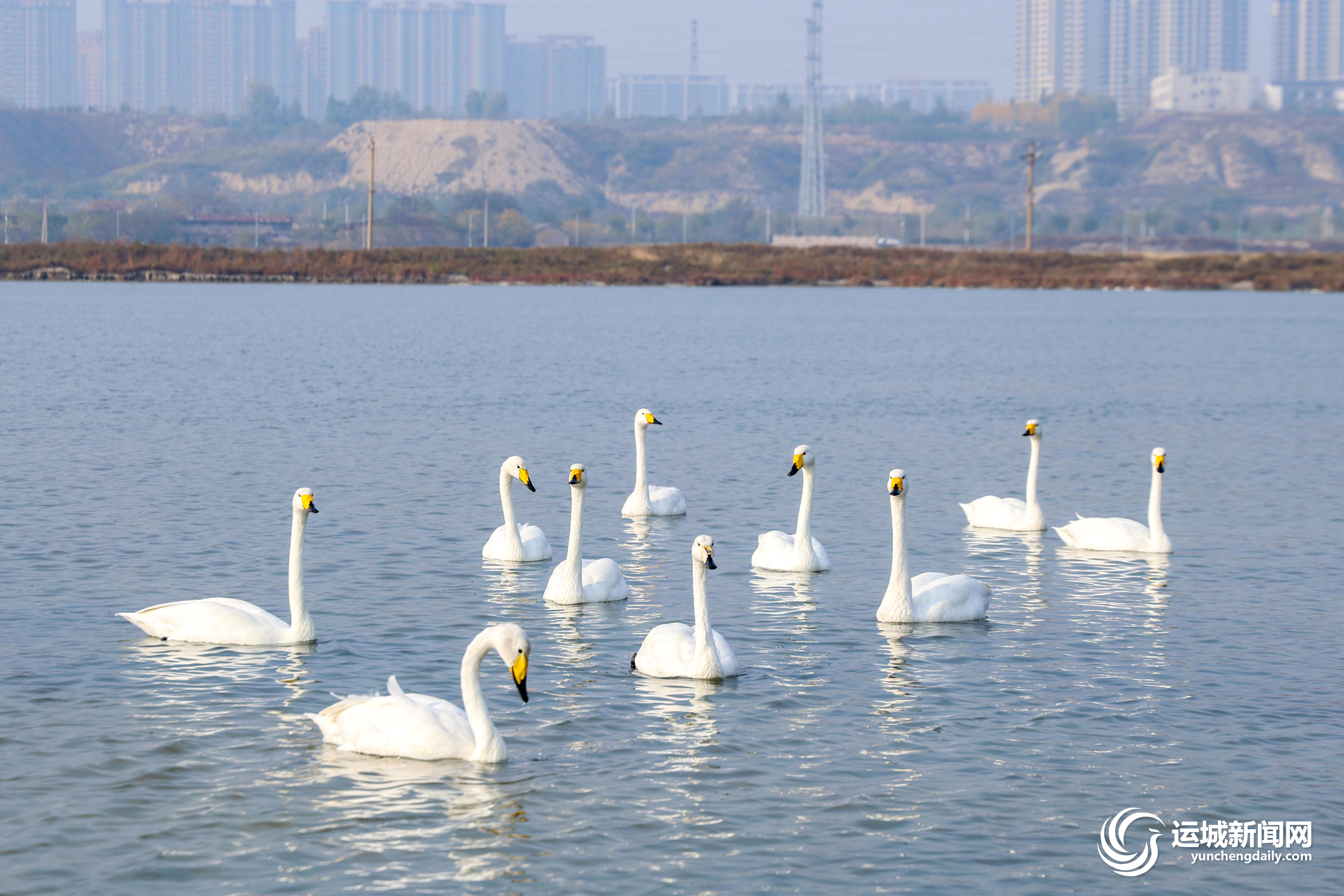 11月7日,天鹅在运城盐湖游弋。
