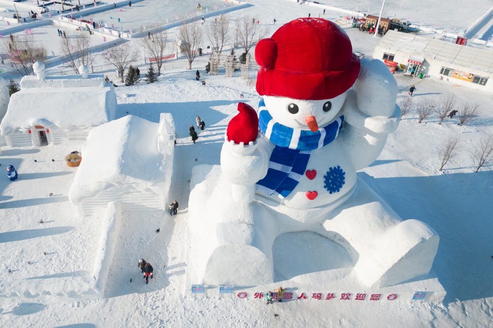 2024年1月9日,游客在哈尔滨外滩雪人码头游玩(无人机照片)。新华社记者 张 涛 摄