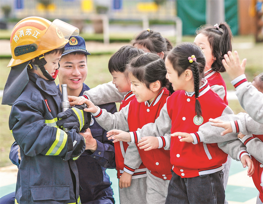 11月8日,在江苏省兴化市文峰幼儿园,小朋友在兴化市消防救援大队消防员的指导下体验穿戴消防灭火防护服。