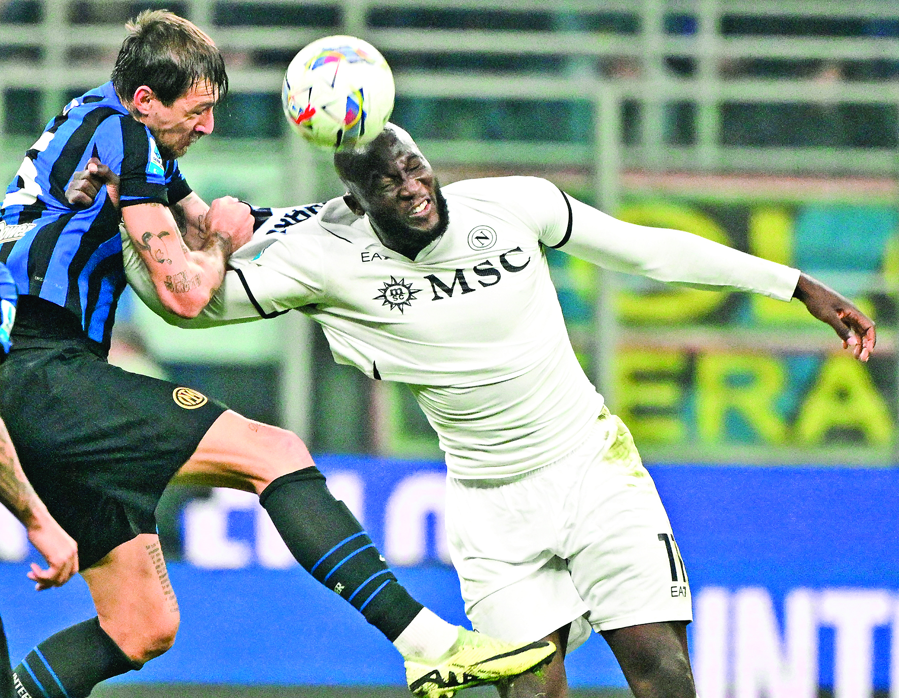 11月10日,国际米兰队球员阿切尔比(左)与那不勒斯队球员卢卡库在比赛中拼抢。