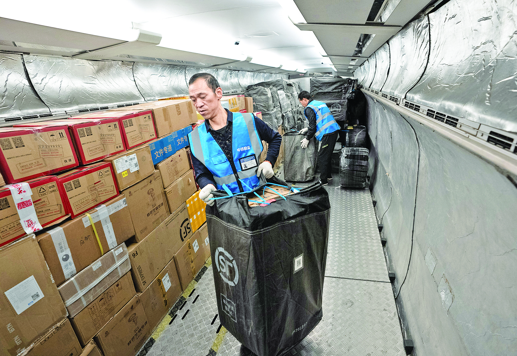 11月11日,在成都双流西站,工人将电商快件从动车上搬运下来。