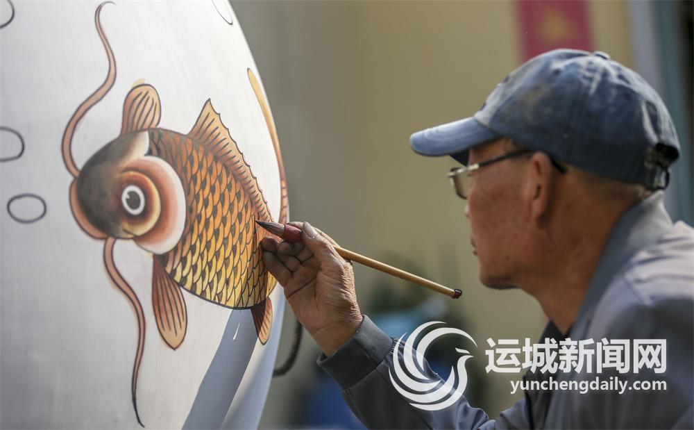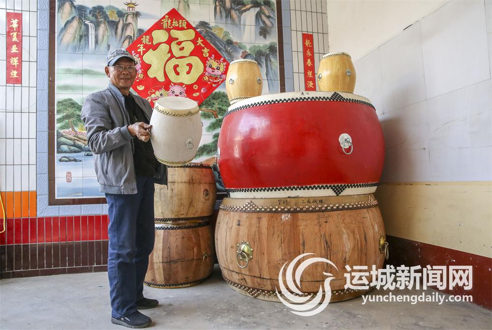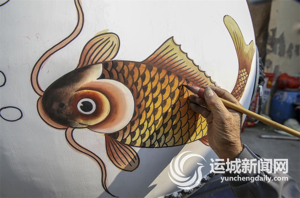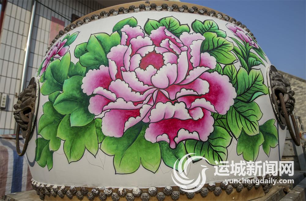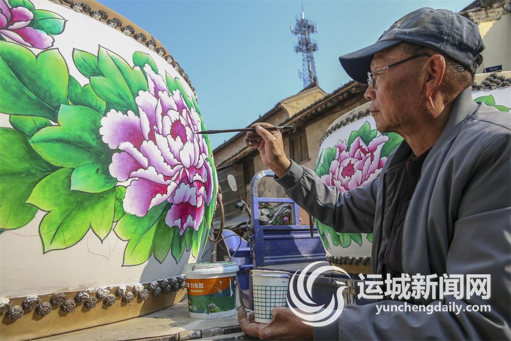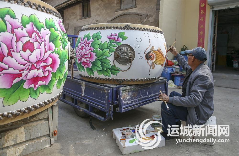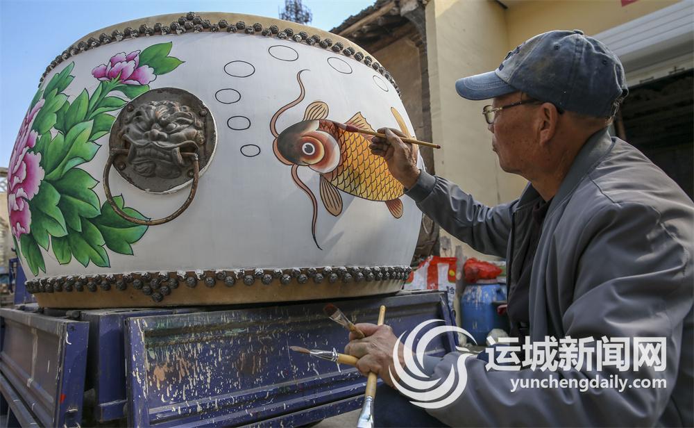 11月9日,稷山县清河镇上费村村民朱新民为大鼓作画。