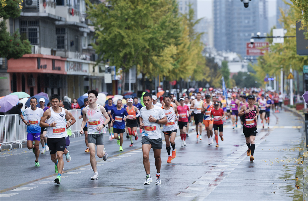 11月17日,参赛选手在比赛中。当日,2024建德马拉松在浙江省建德市新安江畔鸣枪开跑。 新华社记者 徐 昱 摄