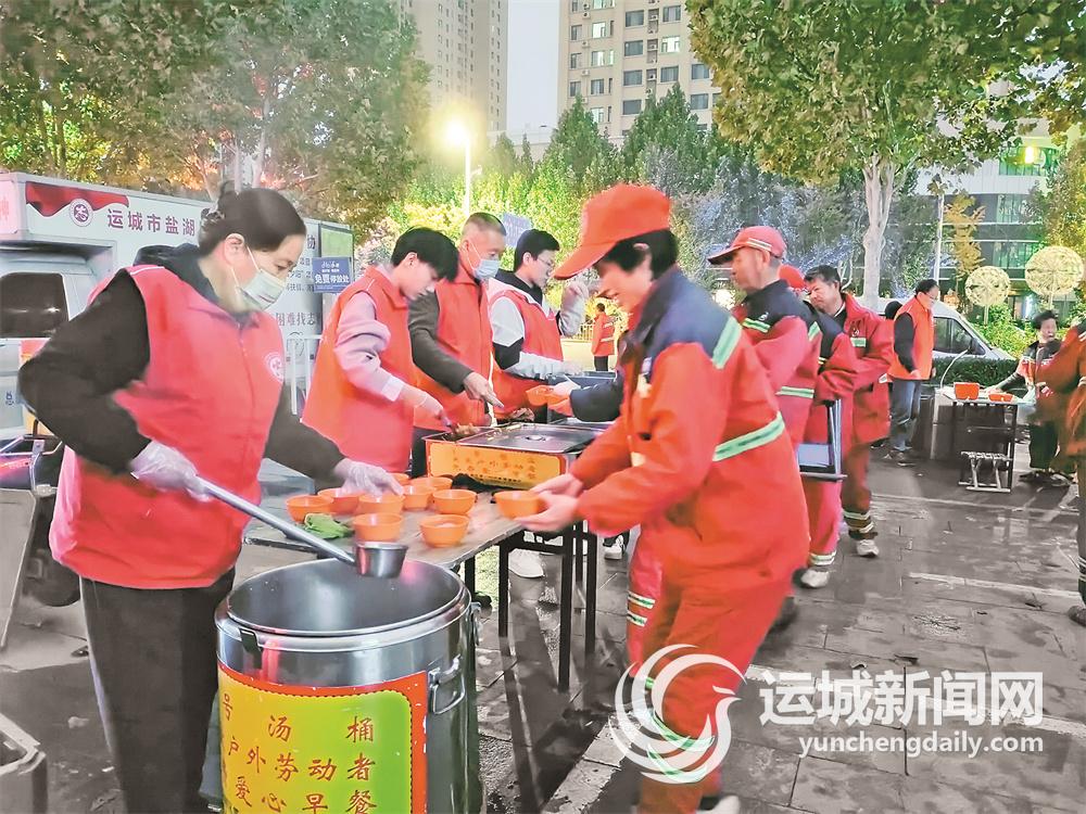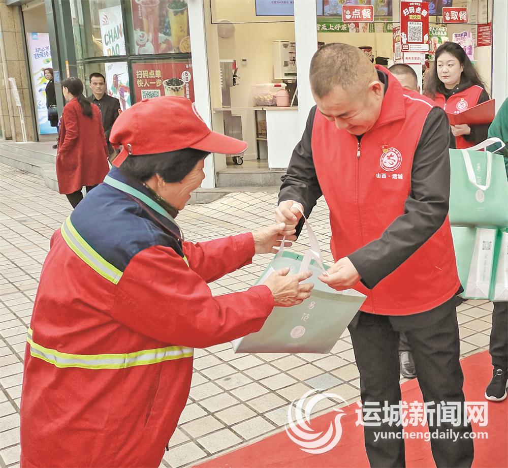 这是盐湖区第一时间志愿者协会联合运城市南风购物中心有限公司开展的“为环卫工人送温暖”活动现场。志愿者和爱心人士用一副副饱含心意的手套和一句句真切的暖心问候,将温暖和关爱送到了环卫工人心坎上。