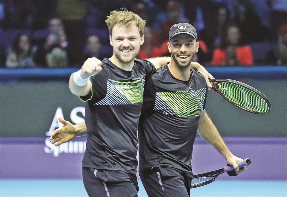 11月17日,克拉维茨(左)/皮茨庆祝获胜。当日,在意大利都灵进行的ATP年终总决赛男双决赛中,德国组合克拉维茨/皮茨2比0战胜阿雷瓦洛(萨尔瓦多)/帕维奇(克罗地亚)组合,夺得冠军。