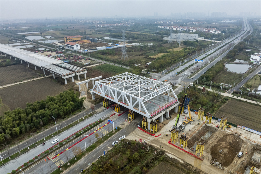11月19日拍摄的施工现场(无人机照片)。当日,由中铁十一局承建的新港高速双柳长江大桥及接线工程跨问津大道钢桁梁顶推施工完成。钢桁梁长68米,高10.5米,宽36.24米,整体重量约1675吨,跨越问津大道10条车道。