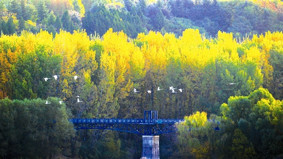 11月19日,一队越冬的大天鹅从三门峡天鹅湖国家城市湿地公园苍龙湖上空掠过,为冬日里的黄河湿地增添了一抹亮色。记者 孙猛 摄