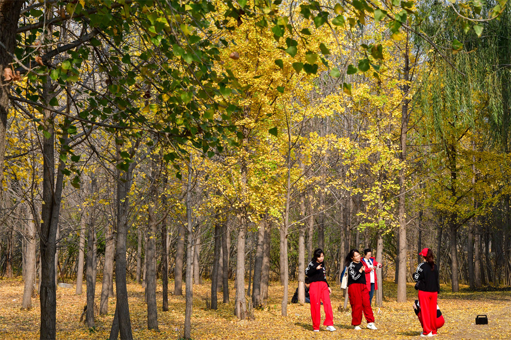 11月20日,黄河山东济南段岸边银杏泛黄、候鸟翔集,吸引游人前来观赏游玩。