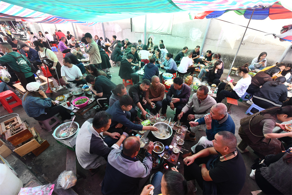 小煤炉火锅、简易的桌椅、现切的新鲜食材,大家围炉而坐,互相聊着家长里短,欢声笑语间如共进邻里百家宴……因其独有的烟火气和浓浓的人情味,成团镇早市走红网络,吸引越来越多市民和游客前来打卡,体验别具风格的乡村早市文化。