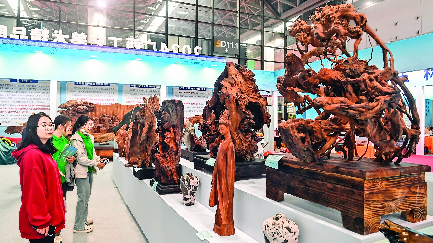▲11月24日,在南宁国际会展中心,观众在观赏木质工艺美术精品。