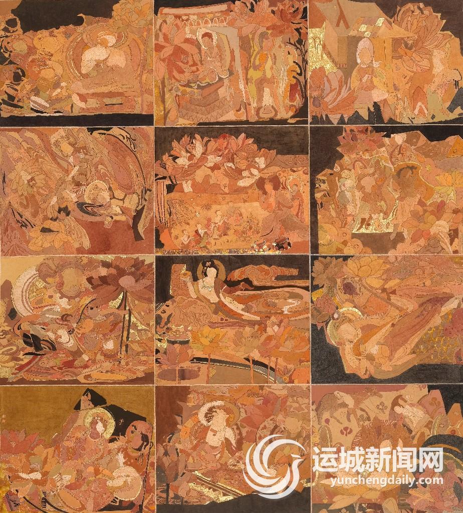 安雯,1993年生,盐湖区人,毕业于西安美术学院,现为运城市美术家协会会员、盐湖区美术家协会副秘书长、盐湖区书法家协会会员。《鸿翼·若观踏歌》是她首次入选国展的作品。该作品以12幅小画作组合而成,历时多半年创作,其间画面构图、色彩稿等多次打磨、调整。该画作以敦煌壁画元素为主要创作对象,把壁画中提取的物象和莲等元素相结合,虚化敦煌飞天形象,着重对物象间关系的处理,运用黑白灰色彩构成,最终呈现给观者一种超脱尘世的宁静之美。