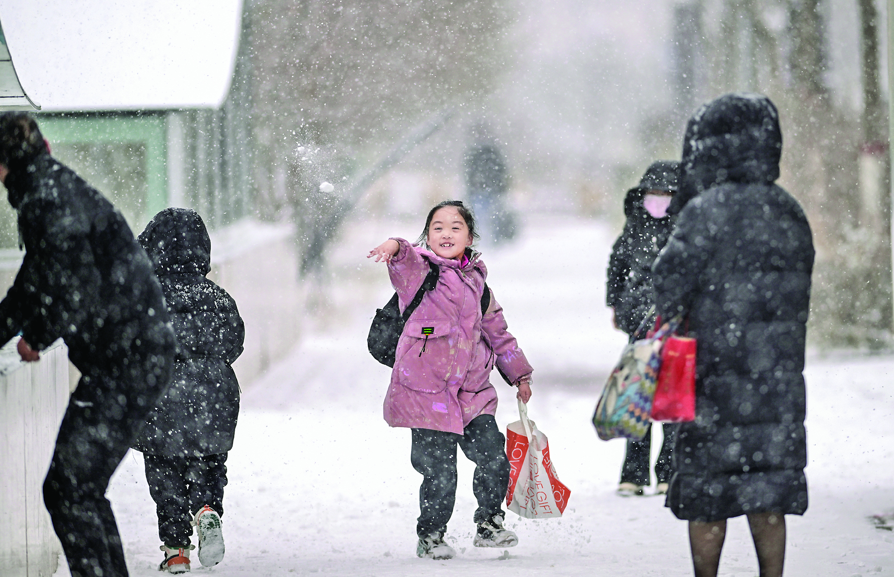 ▲11月24日,一名小朋友在雪中和伙伴们玩耍。