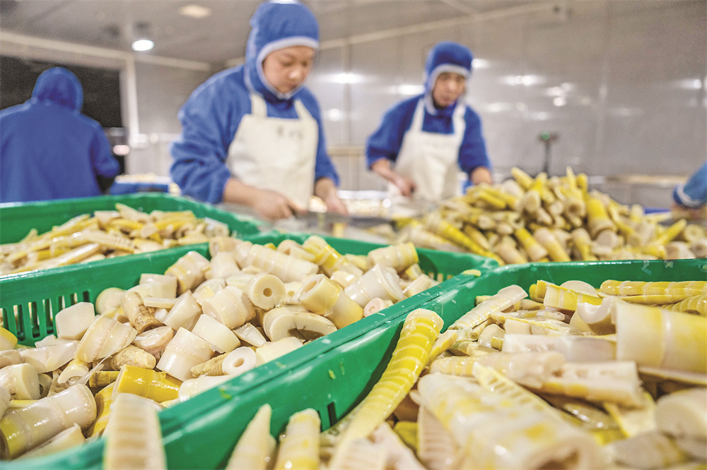 11月27日,工人在桃江县马迹塘镇笋竹特色产业园内一家鲜笋加工企业生产车间加工鲜笋。
