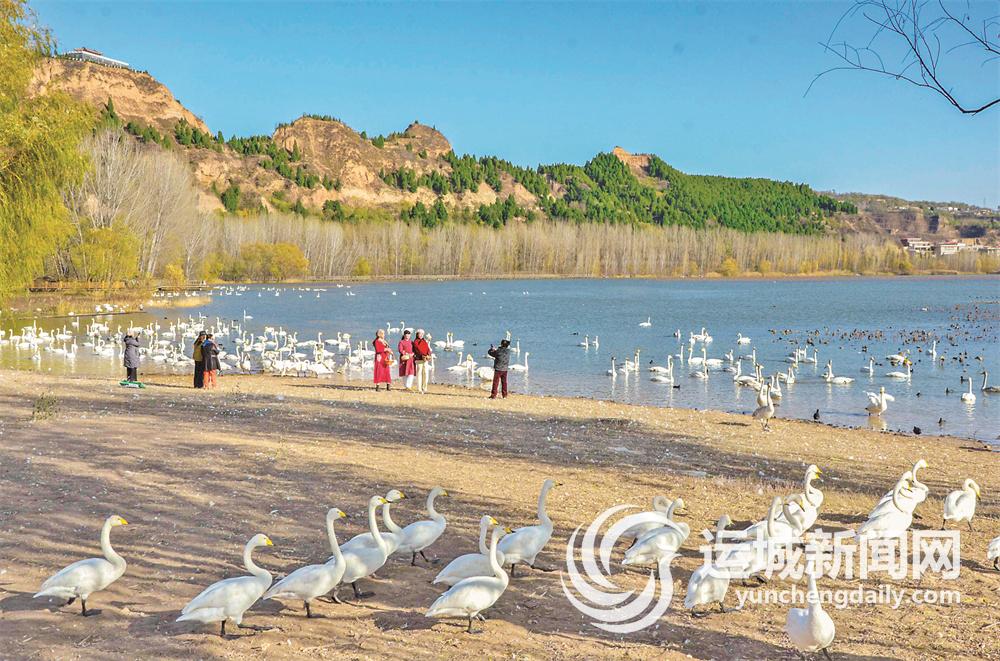11月26日,游客在平陆黄河湿地欣赏白天鹅。 特约摄影 解建国 摄