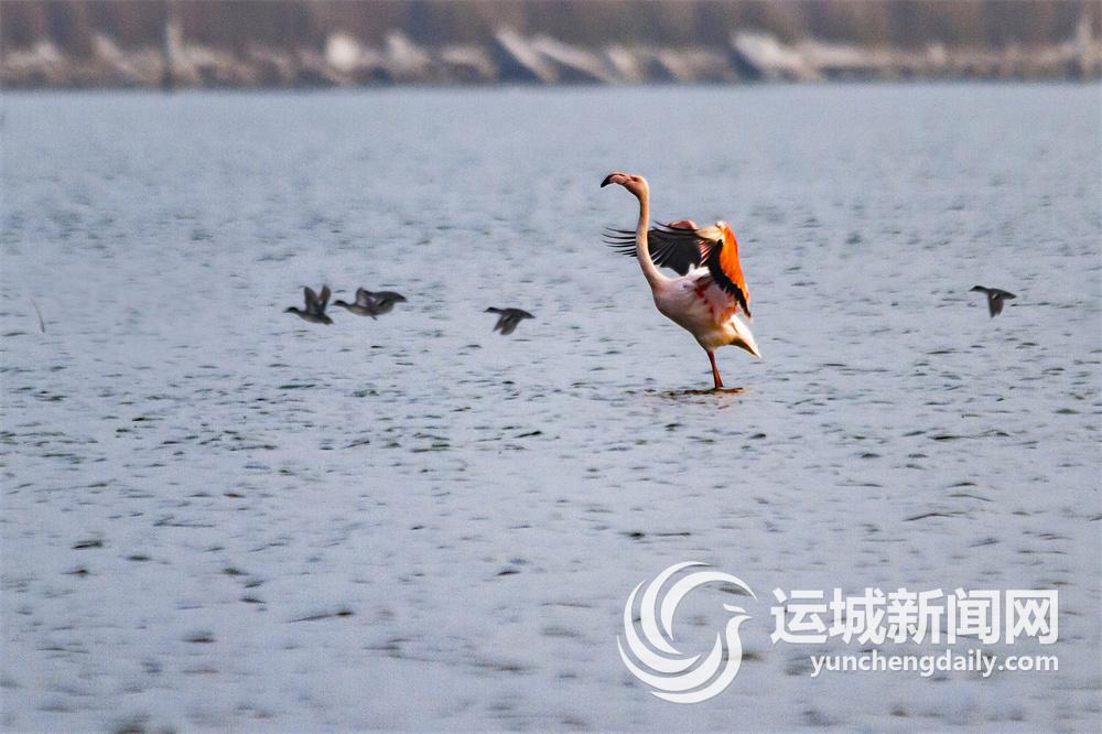 11月23日,一只火烈鸟在运城盐湖嬉戏觅食,为冬日的盐湖带来了生机和色彩。 姜桦 摄