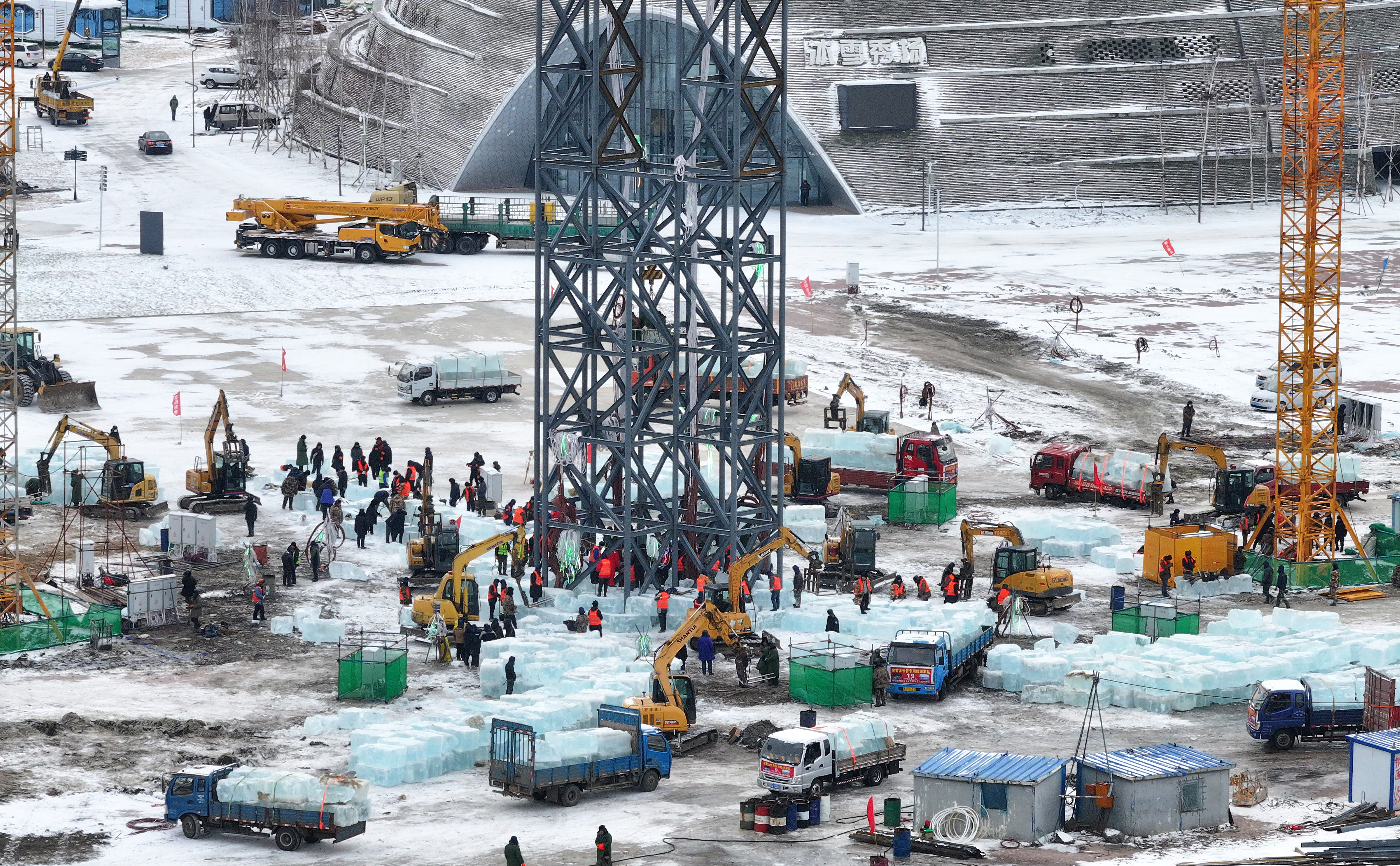 当日,第二十六届哈尔滨冰雪大世界冰建施工正式开始,园区内一片繁忙景象。 新华社发