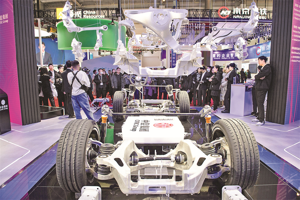 11月28日在中信集团展台拍摄的轻量化铝制汽车零部件。
