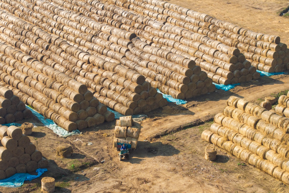 12月1日,在湖南省益阳市南县浪拔湖镇太阳山村一秸秆饲料化利用工厂,工人在运输秸秆。近年来,南县坚持绿色环保发展理念,结合自身产业结构特点,积极探索多种秸秆利用方式,促进秸秆饲料化、饵料化、肥料化利用。目前,该县秸秆综合利用率已达90%以上,实现变废为宝、化废为利。