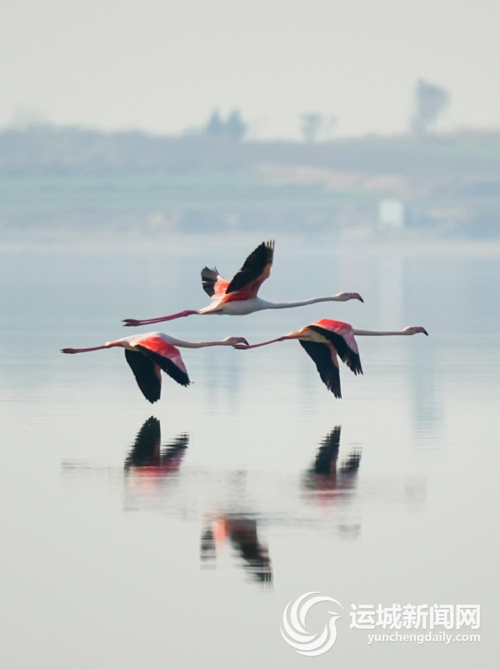 12月1日,在运城盐湖,火烈鸟展翅翱翔,为冬日盐湖带来了勃勃生机和亮色。