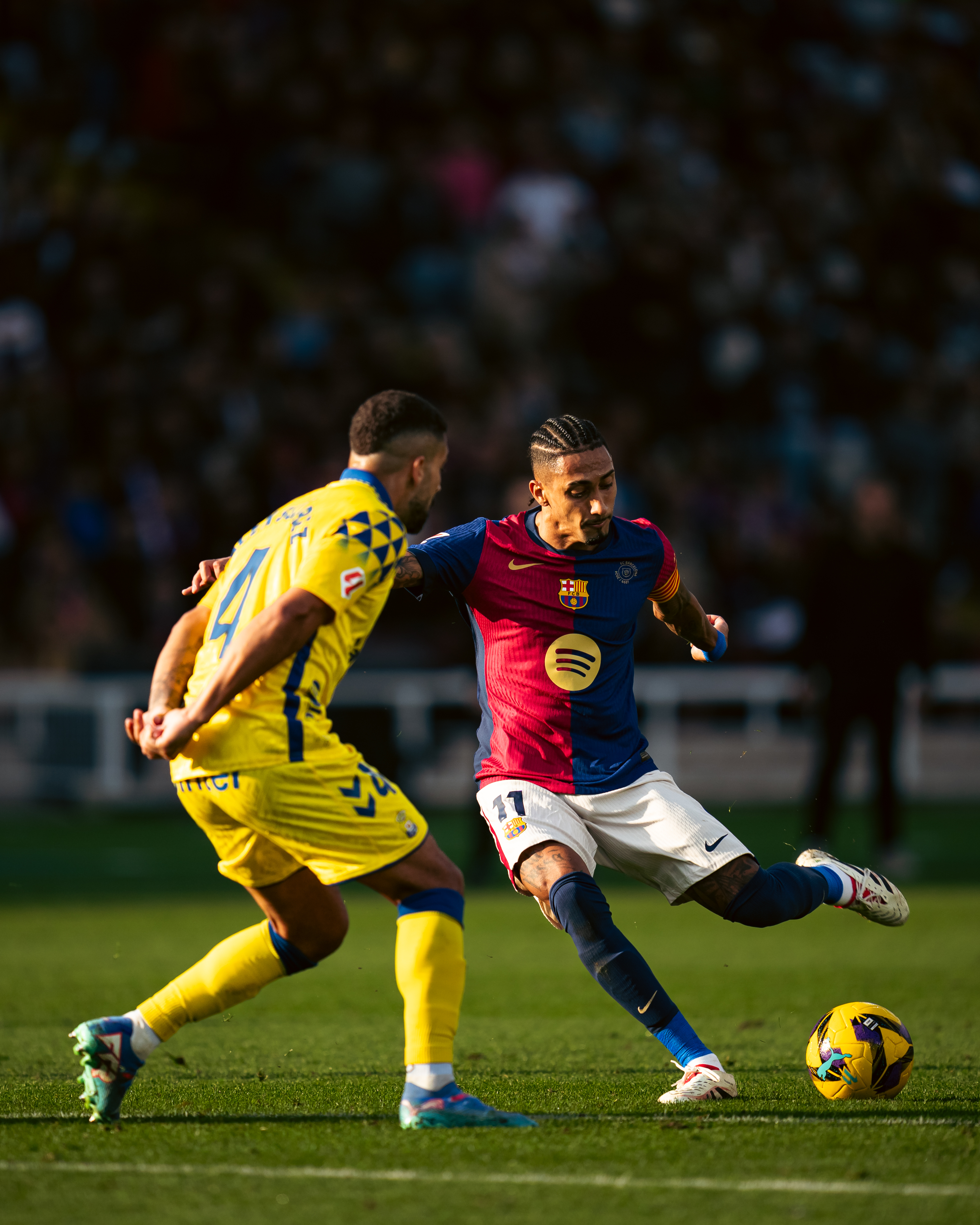 11月30日,巴塞罗那队球员拉菲尼亚(右)和拉斯帕尔马斯队球员亚历克斯·苏亚雷斯在比赛中拼抢。