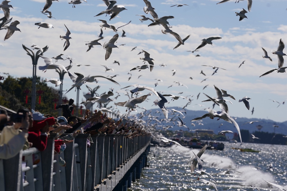 12月1日,游客在昆明滇池海埂观景大道观赏红嘴鸥。